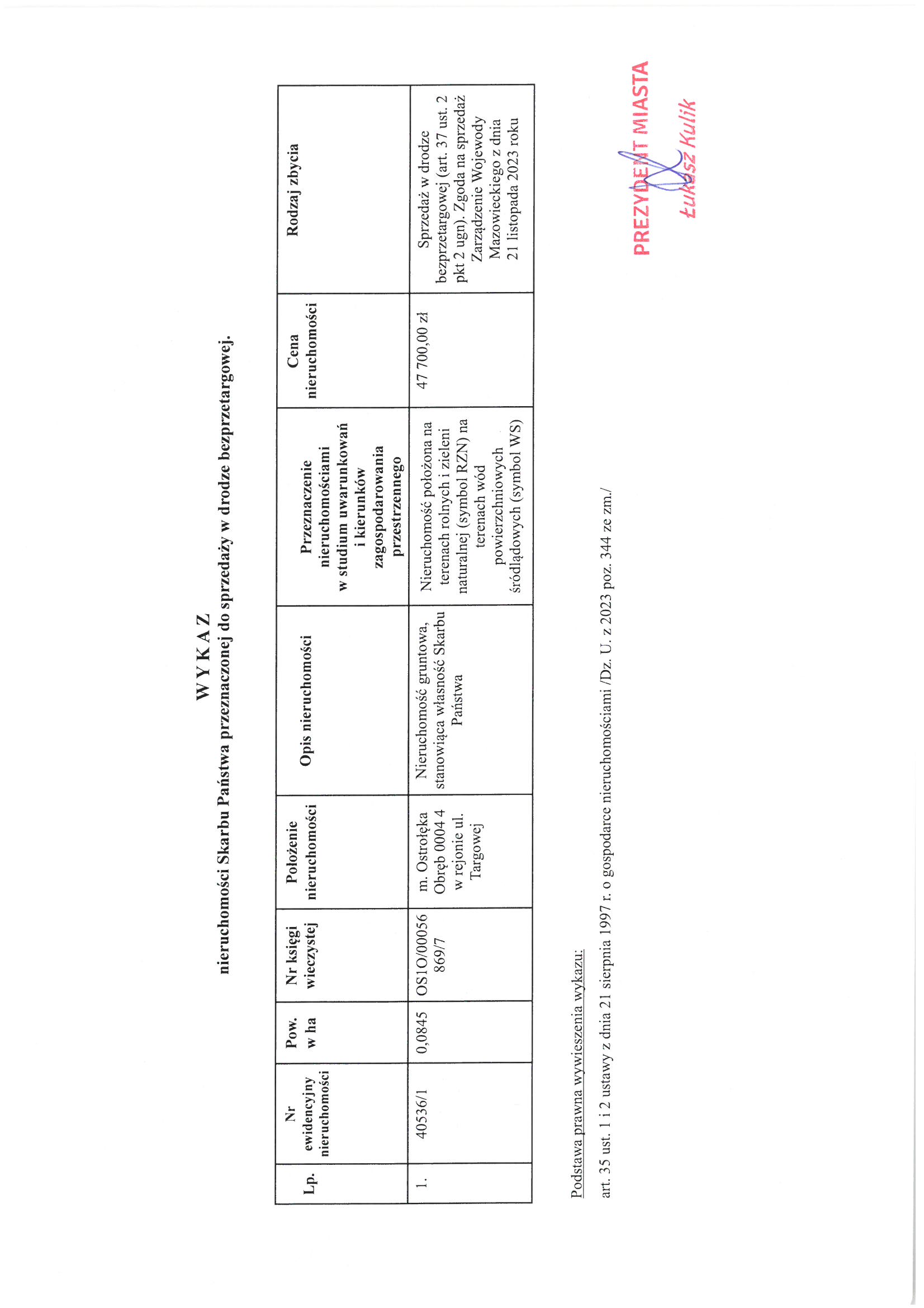 do sprzedaży w drodze bezprzetargowej nieruchomości gruntowej, stanowiącej własność Skarbu Państwa (dz. nr 40536/1)