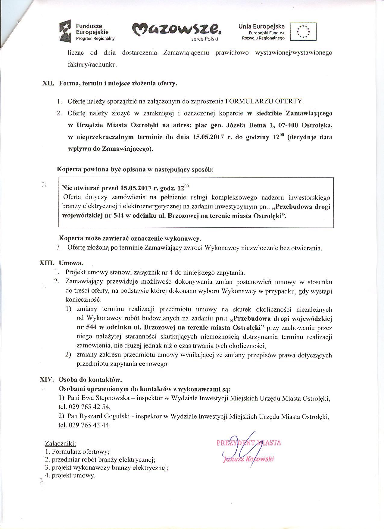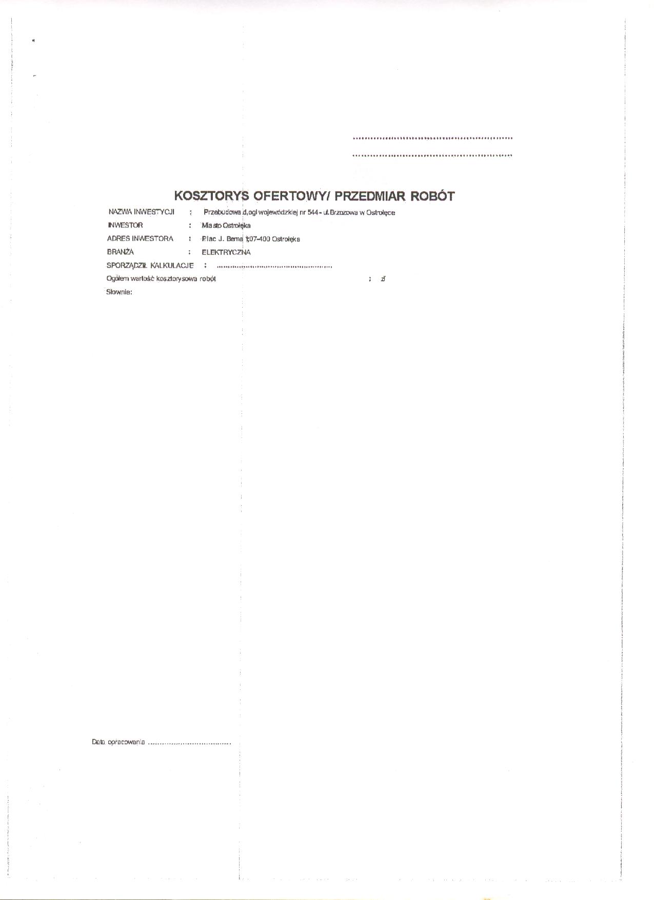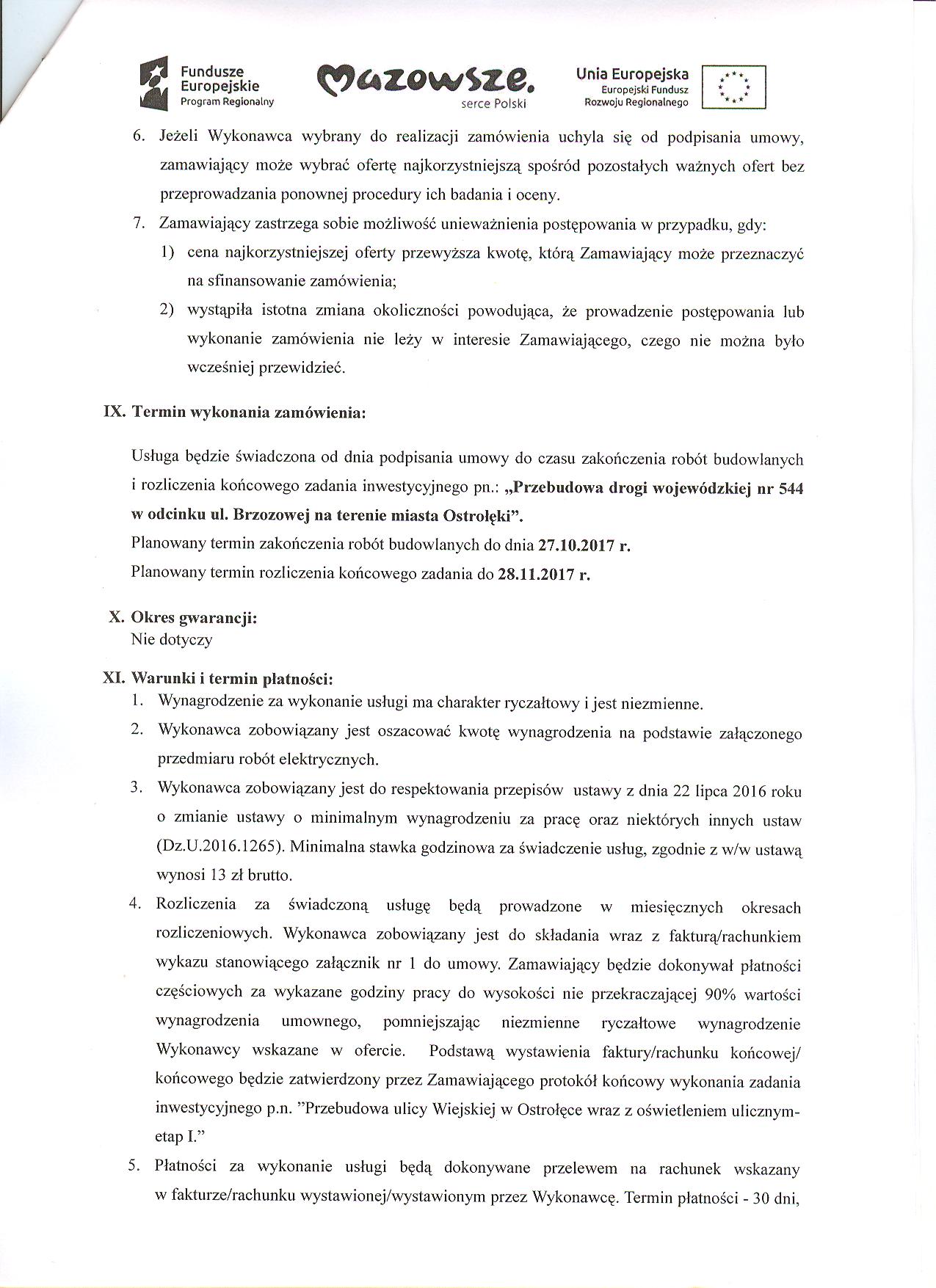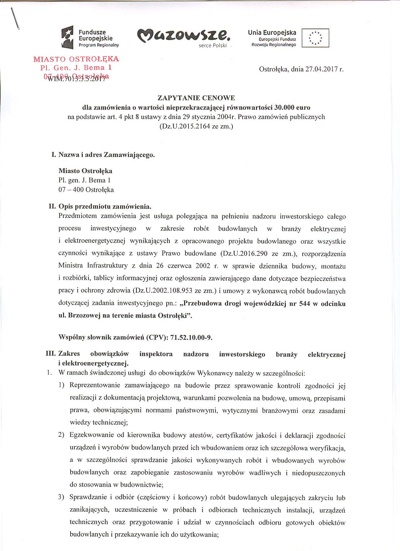 Wersja strony w formacie XML| Zamówienie na | Przedmiotem zamówienia jest usługa polegająca na pełnieniu nadzoru inwestorskiego całego procesu inwestycyjnego w zakresie robót budowlanych w branży elektrycznej i elektroenergetycznej na zadaniu inwestycyjnego pn.: „Przebudowa drogi wojewódzkiej nr 544 w odcinku ul. Brzozowej na terenie miasta Ostrołęki”. |